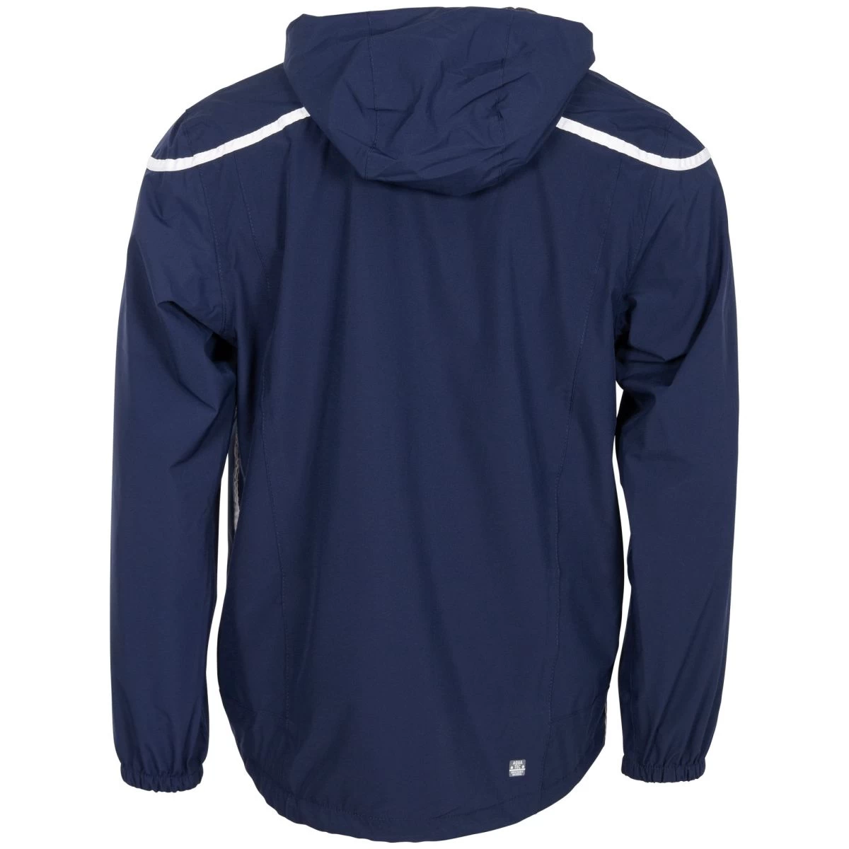 This functional, comfortable training jacket is made of woven polyester (8000MM / 3000MVP). This material ensures that the jacket is wind proof and water resistant with a high breathability. The body contains a mesh lining and there’s smooth taffeta in the sleeves. At the front two pockets with zip and a chest pocket with zip. For extra comfort in the cold, the jacket has an elastic strap with stoppers at the waist and also in the hood. Thanks to the opening in the lining, the jacket is suitable for printing.